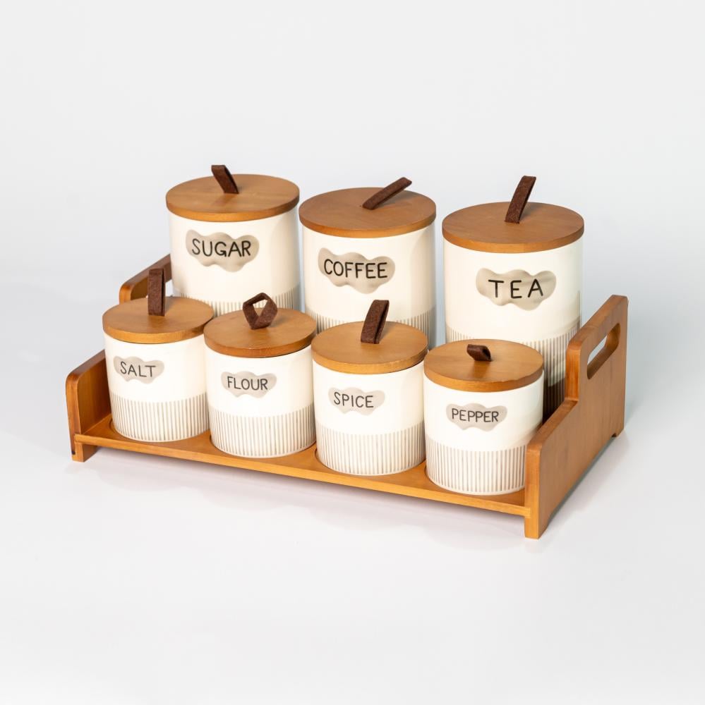 طقم علب بهارات 7 حبات بقاعدة خشبيه
